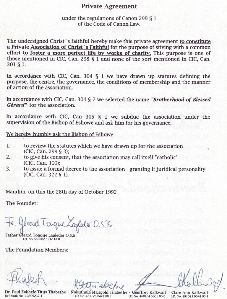 Mandini, on this the 28th day of October 1992 The Founder: Father Gérard Tonque Lagleder O.S.B. · I.D. No. 550702 5732 18 0 The Foundation Members: Dr. Paul Zakhele Titus Thabethe · Ref.Book No. 1-3909237-4 |